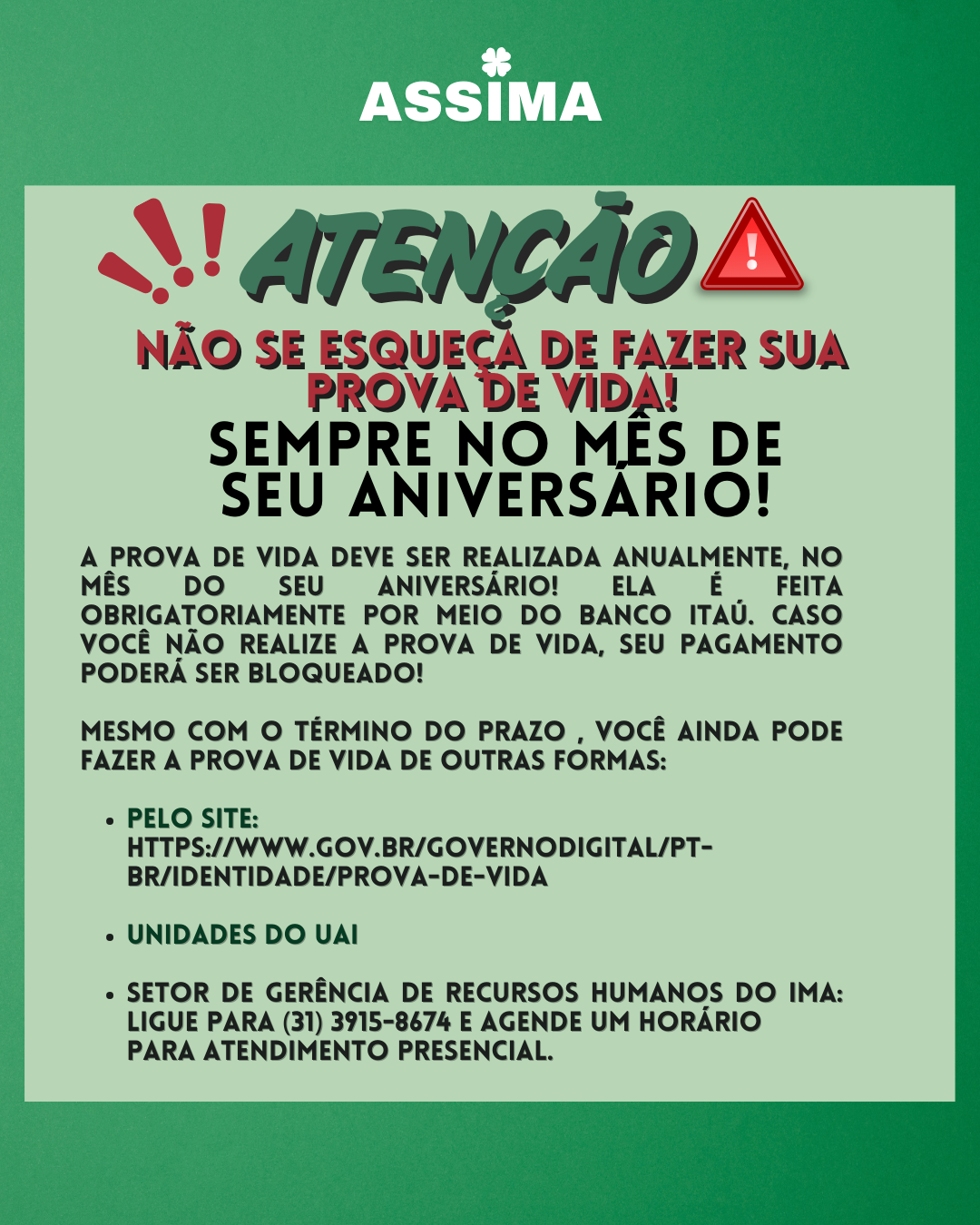 A Prova de Vida deve ser realizada anualmente, sempre no mês do seu aniversário, exclusivamente pelo Banco Itaú. Lembre-se: quem não fizer pode ter o pagamento bloqueado.