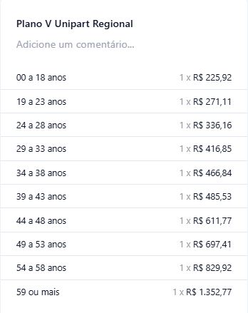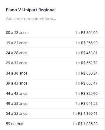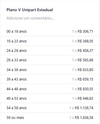 (As tabelas representam um preço de referência, e podem apresentar alterações à depender da época de sua consulta, devido à eventuais reajustes aplicados pelas operadoras, para saber valores exatos e atualizados, entre em contato com o consultor comercial)